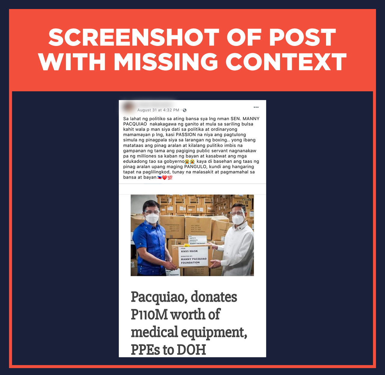 A photo of Senator Manny Pacquiao circulating on Facebook claimed that he donated P110 million worth of medical equipment and personal protective equipment to the Department of Health.