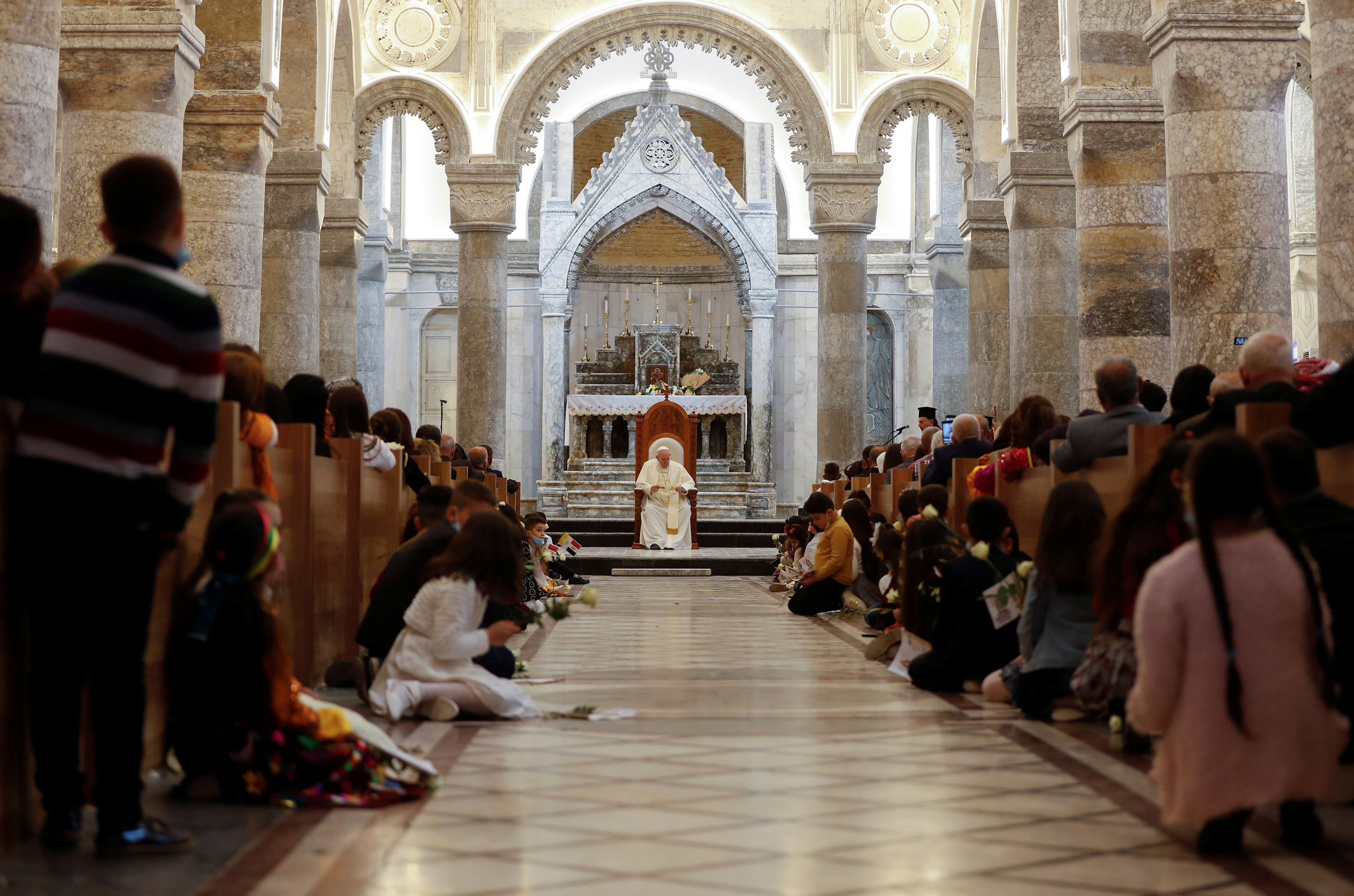 Pope Francis visits the Syro-Catholic Cathedral of “Our Lady of Salvation” in Baghdad, Iraq, on March 5, 2021.